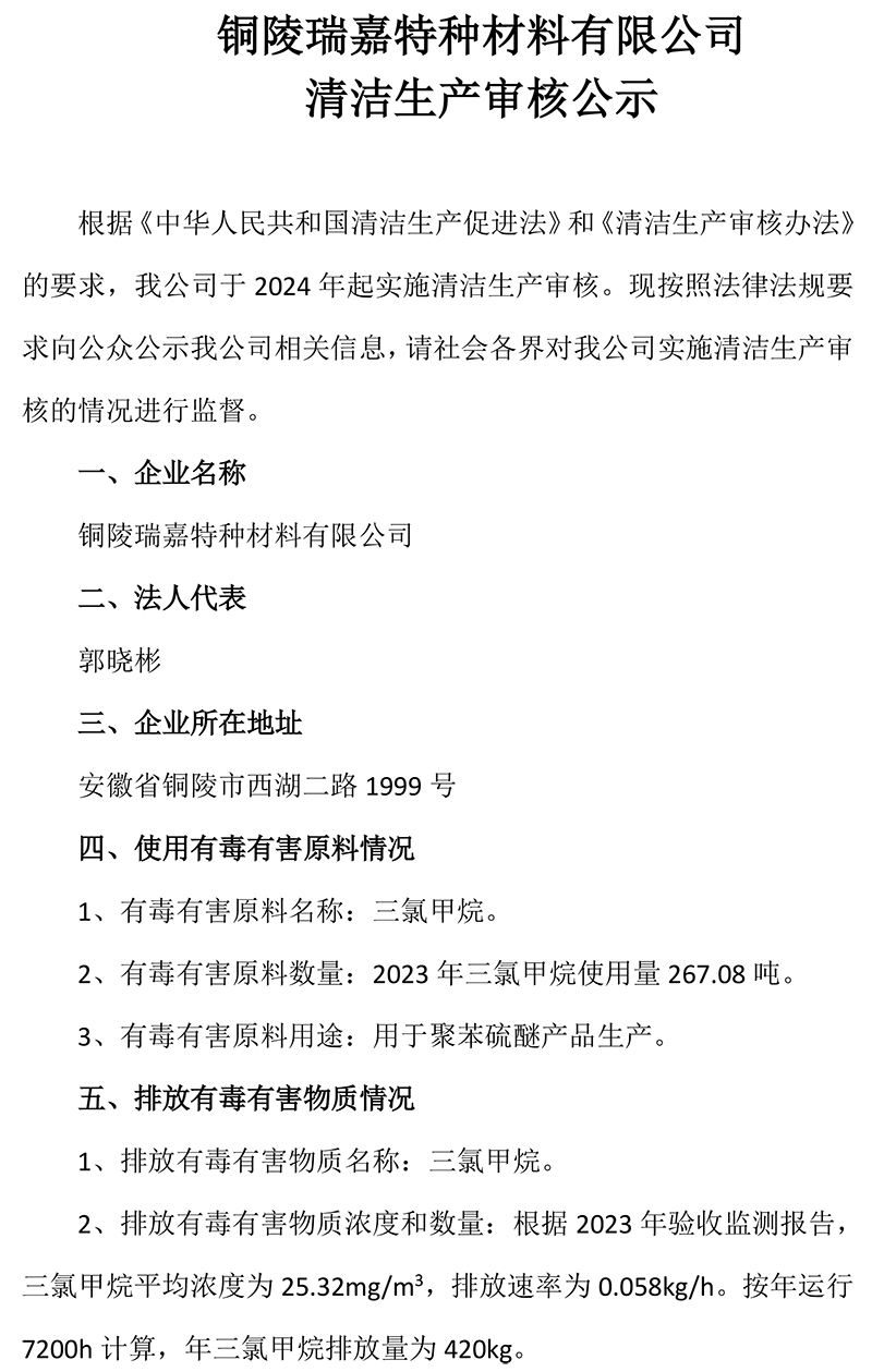 銅陵瑞嘉特種材料有限公司 清潔生產審核公示